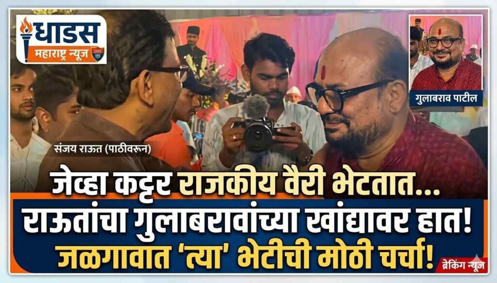 राजकारणात कोणीच कोणाचा कायमचा शत्रू किंवा मित्र नसतो, असं म्हटलं जातं. याचाच प्रत्यय जळगावमध्ये एका विवाह सोहळ्याच्या निमित्ताने आला. शिवसेना पक्षात फूट पडल्यानंतर गेल्या चार वर्षांपासून एकमेकांचे तोंडही न पाहणारे दोन कट्टर राजकीय विरोधक – खासदार संजय राऊत आणि राज्याचे मदत व पुनर्वसन मंत्री गुलाबराव पाटील – जेव्हा समोरासमोर आले, तेव्हा सर्वांच्याच भुवया उंचावल्या. मात्र, या भेटीत कटुता बाजूला सारून दोन्ही नेत्यांनी एकमेकांना नमस्कार केला, हस्तांदोलन केले आणि विचारपूसही केली.