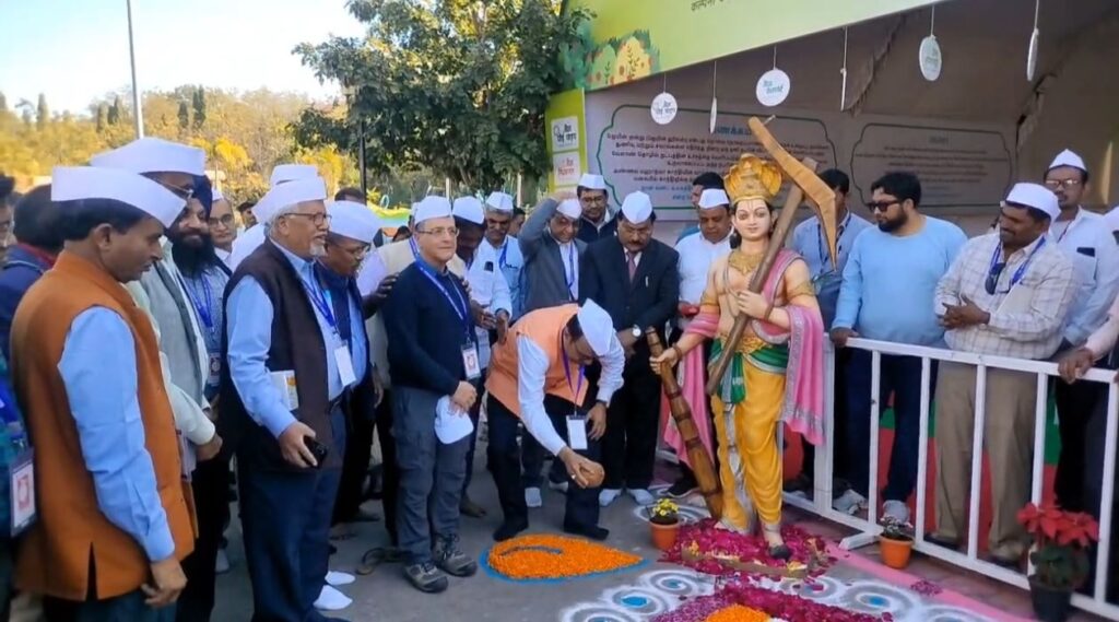 जैन हिल्स येथे सुरू असलेल्या ‘सायन्स टेकॅ@वर्क’ या हायटेक शेतीचा नवा हुंकार कृषीमहोत्सवात राष्ट्रीय कृषी दिन साजरा करण्यात आला. त्यावेळी डॉ. इंद्रमणी मिश्रा यांनी शेतकऱ्यांशी संवाद साधला.