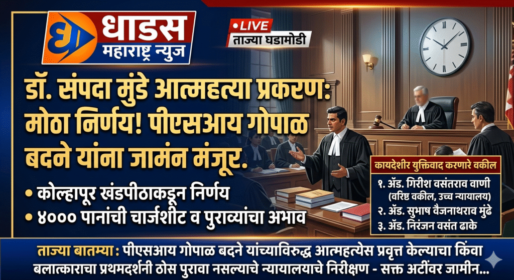 फलटण येथील अत्यंत गाजलेल्या डॉ. संपदा मुंडे आत्महत्या प्रकरणात गेल्या काही महिन्यांपासून न्यायालयीन कोठडीत असलेले आरोपी क्र. १, पीएसआय (पोलीस उपनिरीक्षक) गोपाळ बाळासाहेब बदने यांना मुंबई उच्च न्यायालयाच्या कोल्हापूर सर्किट खंडपीठाने जामीन मंजूर केला आहे. भक्कम कायदेशीर मुद्दे आणि वरिष्ठ वकिलांचा युक्तिवाद ग्राह्य धरत न्यायालयाने हा निर्णय दिला.